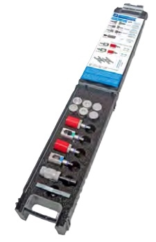 12-piece riveting tool set for pressing solid rivets, riveting self-piercing rivets and pressing-out self-piercing rivets.