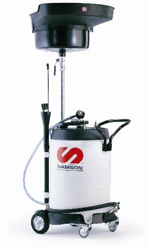 Waste oil suction is carried out by an air operated vacuum pump with no moving and no wearing parts, using a suction probe or connector inserted into the oil dipstick tube. Can be used as a portable unit, disconnected from the air supply, once the vacuum is created inside the container. Discharge is carried through a 6-1/2 foot discharge hose, pressurizing the unit at 7 p.s.i. using a tire inflater. Waste oil gravity collection is carried out using a 5 gallon capacity, height adjustable, over-sized collection bowl with an anti-splash screen that can hold used oil filters for training.